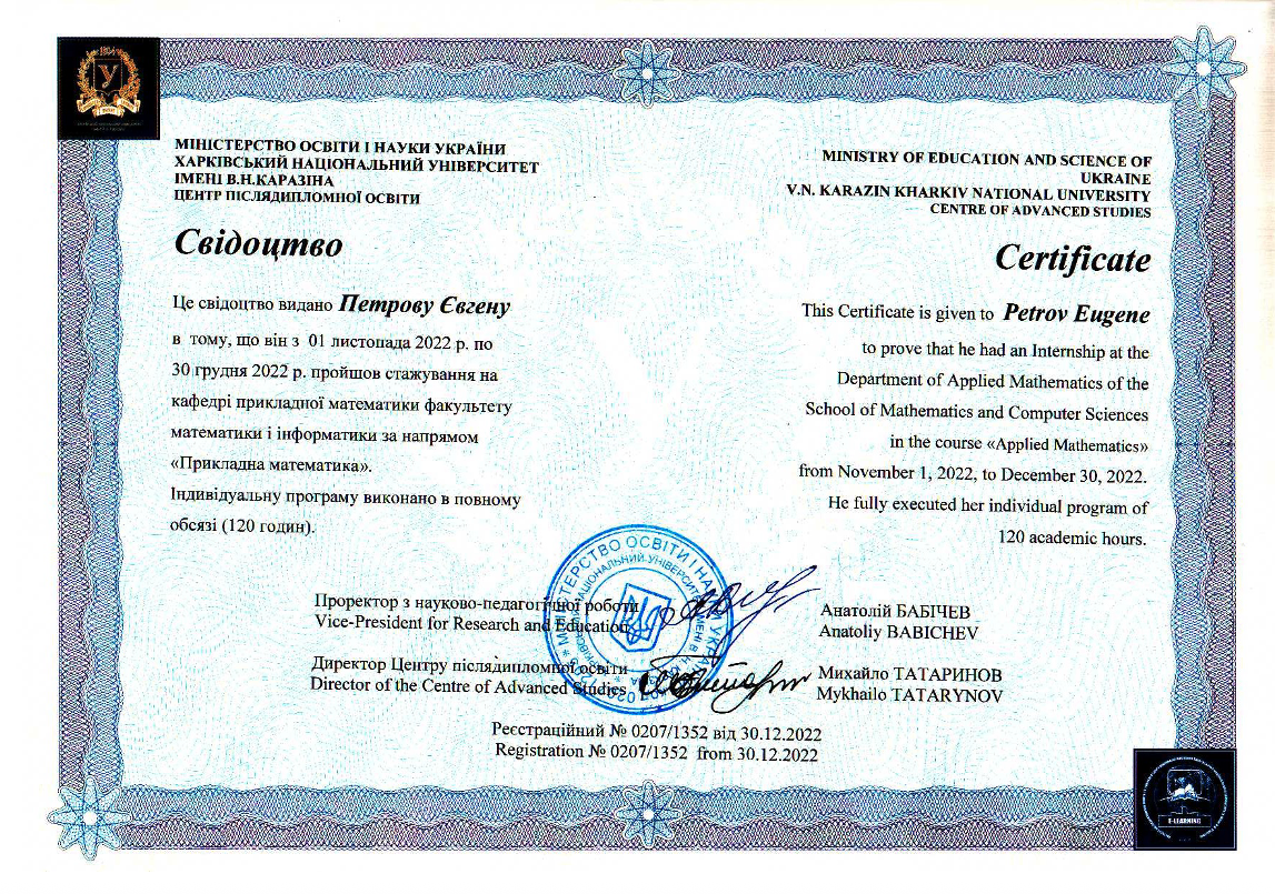 • Харківський національний університет імені В.Н. Каразіна, кафедра прикладної математики, сертифікат, 30.12.2022 р. (120 годин).