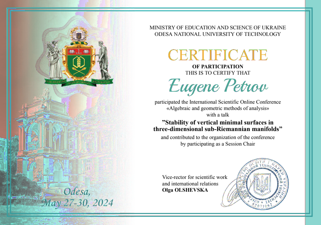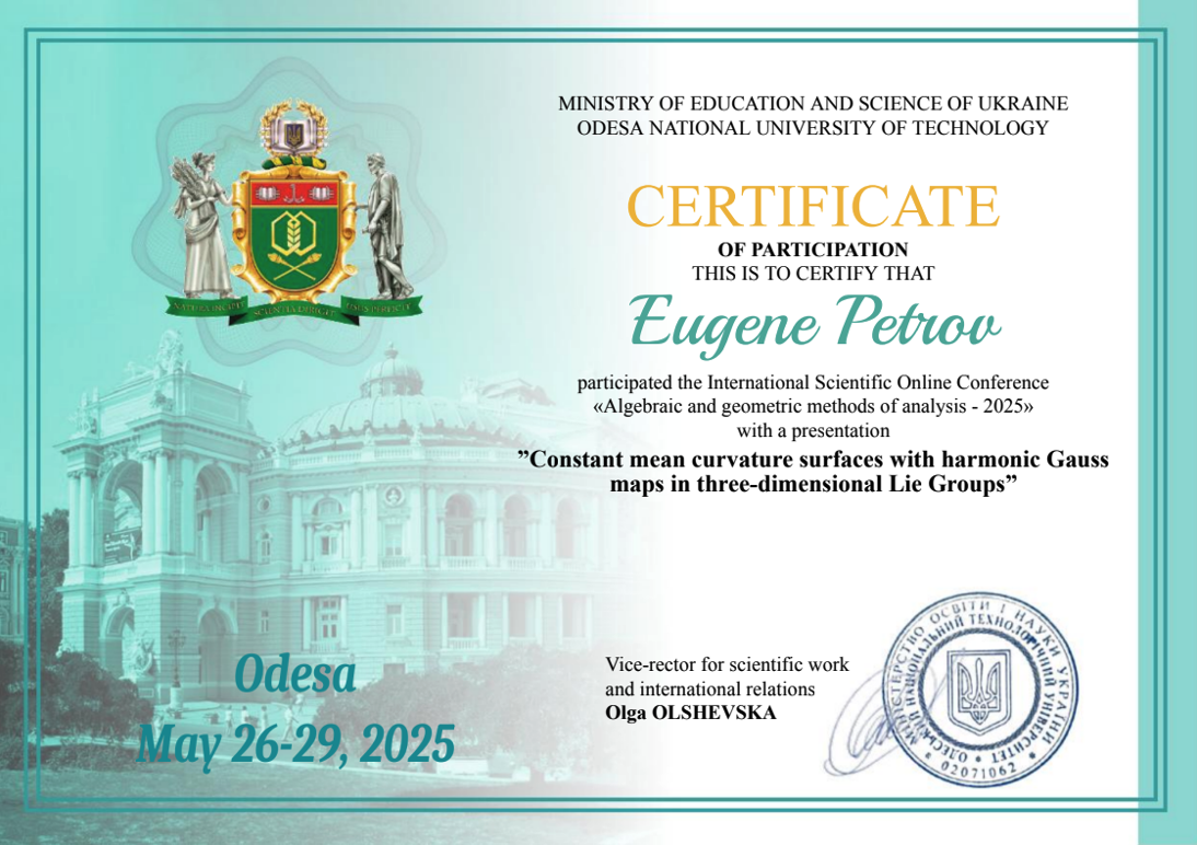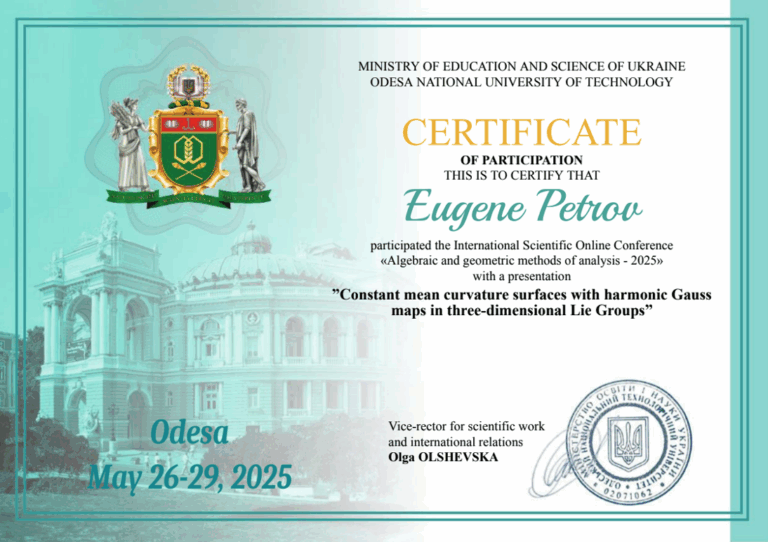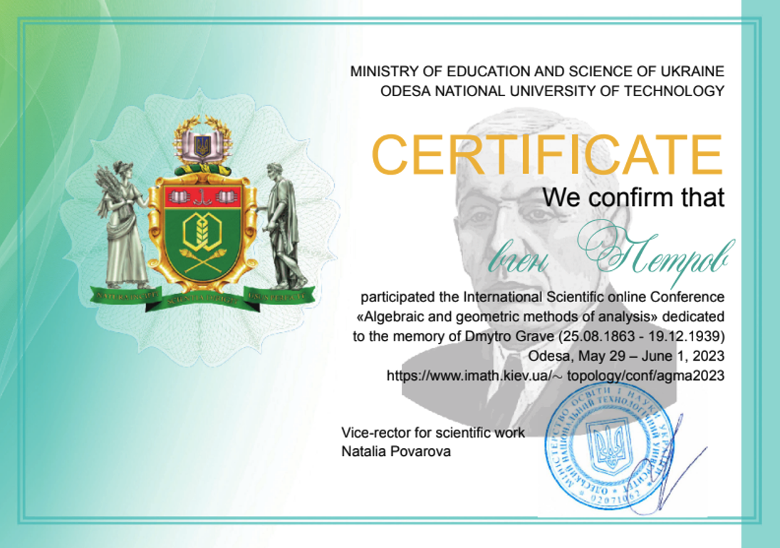 • Одеський національний технологічний університет, участь у конференціях, сертифікати, 01.06.2023, 30.05.2024, 29.05.2025 (60 годин).