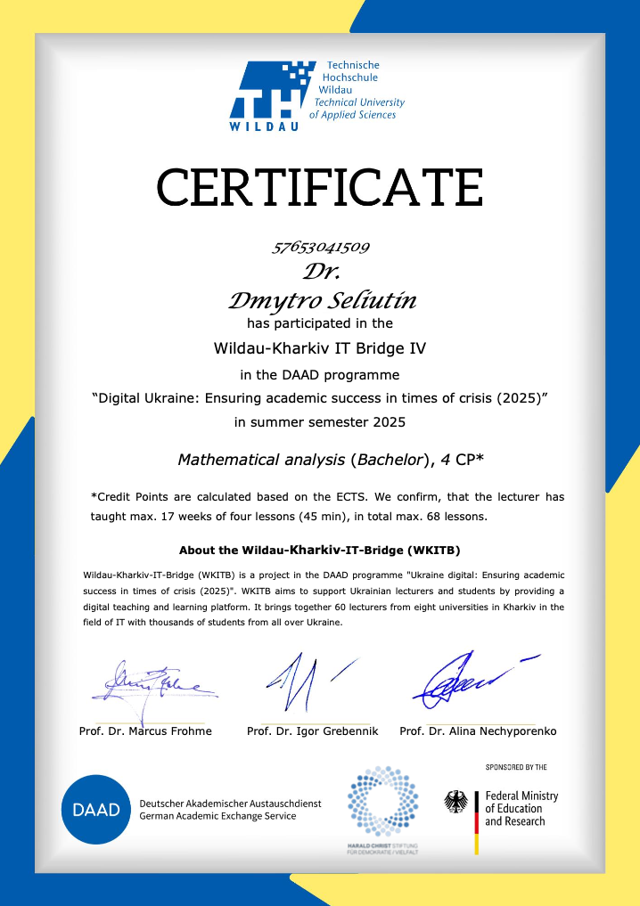 Д. Селютін, Про застосування фільтрів в теорії інтегрування, XVIІІ Міжнародна науково-практична конференція «Сучасні проблеми математики та її застосування в природничих науках та інформаційних технологіях», Харків, 2023.